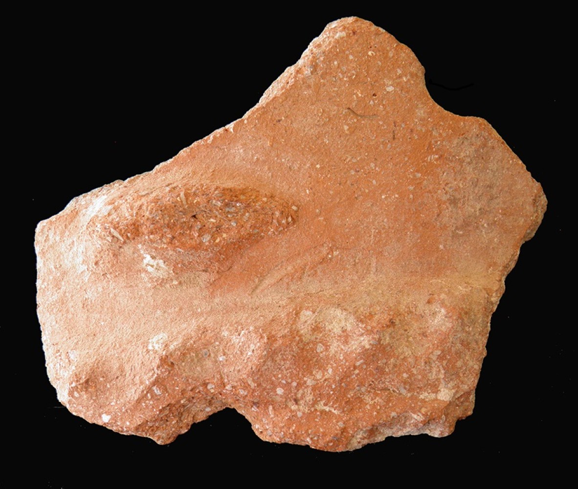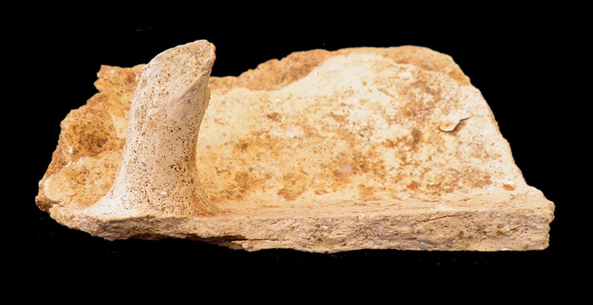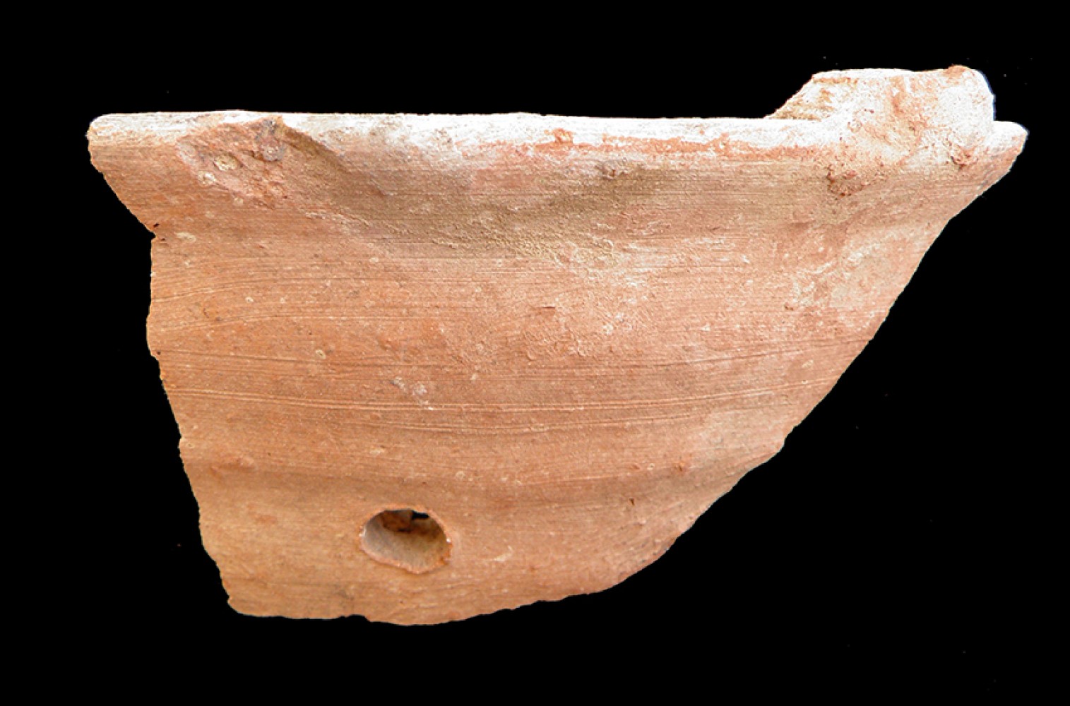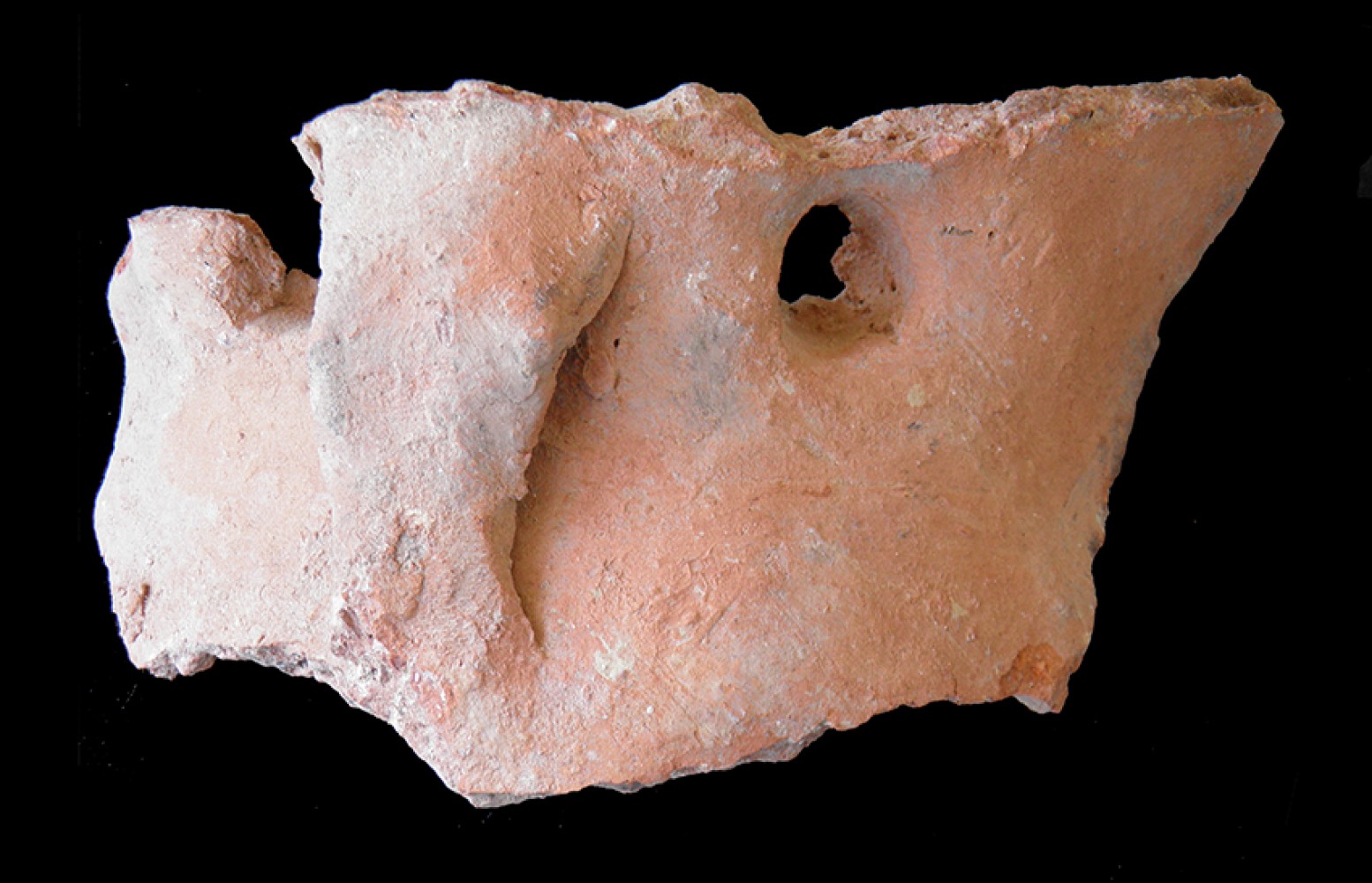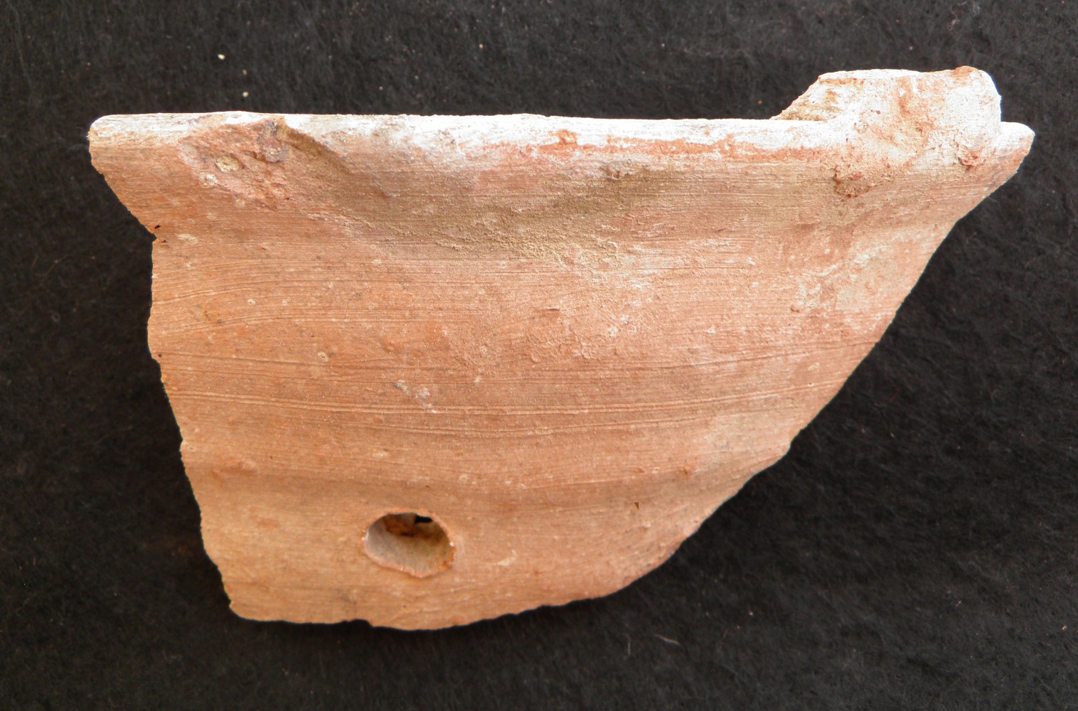 Fragmento en barro cocido. A molde. Pasta anaranjada y en algunas zonas blanquecina. Intrusiones de cuarzo.