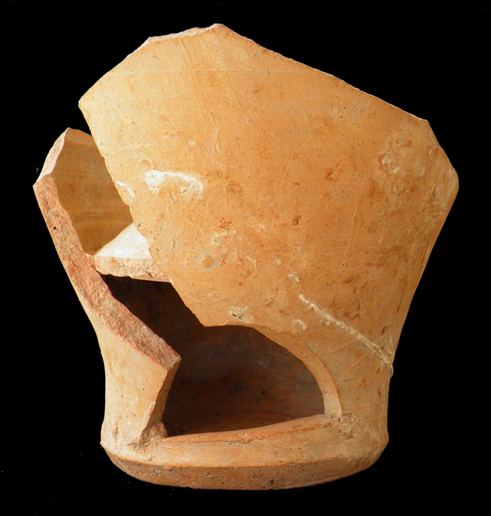 Contenedor de fuego. Fondo plano irregular (posiblemente con tres apéndices). Cuerpo bitroncocónico invertido con un apéndice al interior.