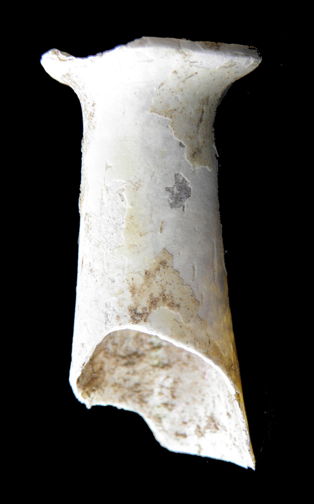 Cabeza de un animal con posibles cuernos y con lo que puede ser el arranque de una asa en su parte trasera y un pequeño orificio de salida en la boca.