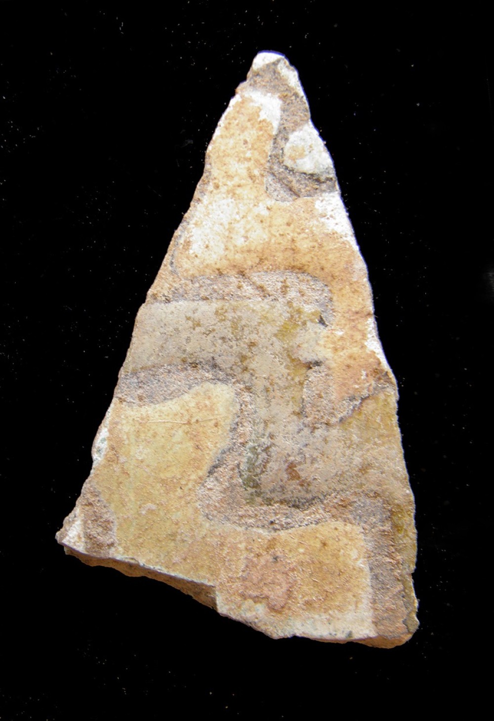 Vedrío melado en lados caras, muy deteriorado. Al interior trazos curvos y mancha al centro de vidriado verde.