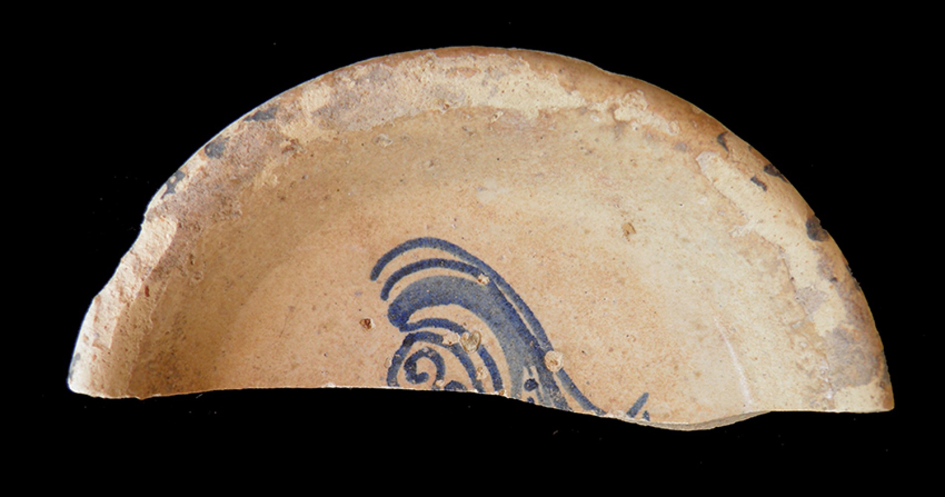 Vidriado blanco con motivos en azul cobalto al interior y puntos en el labio.
