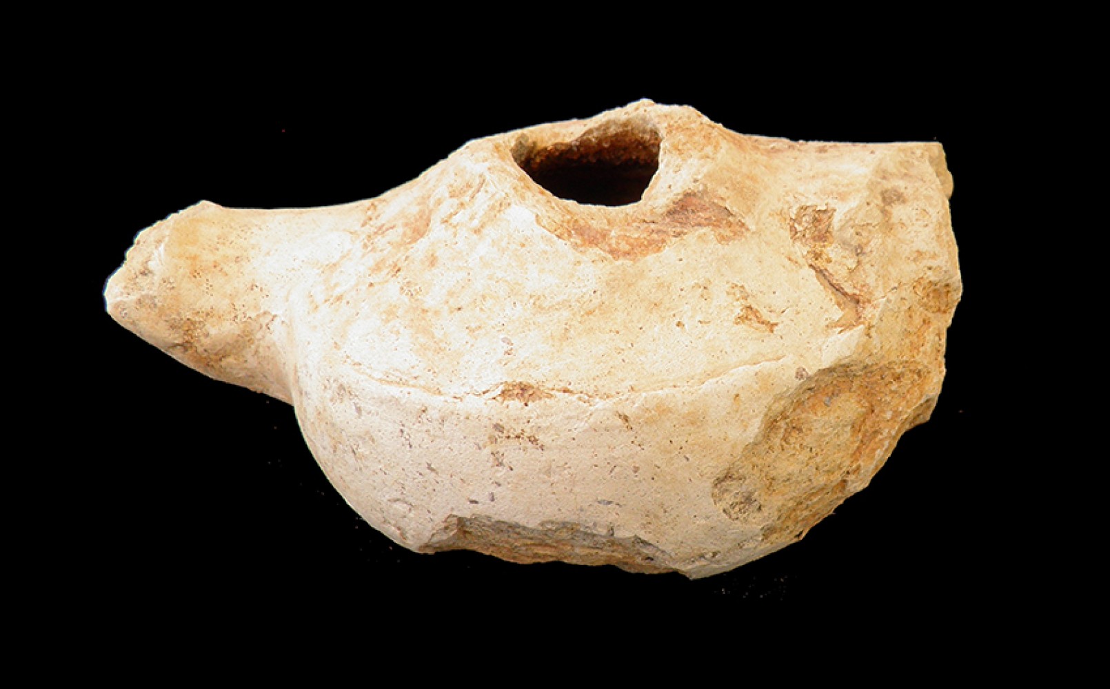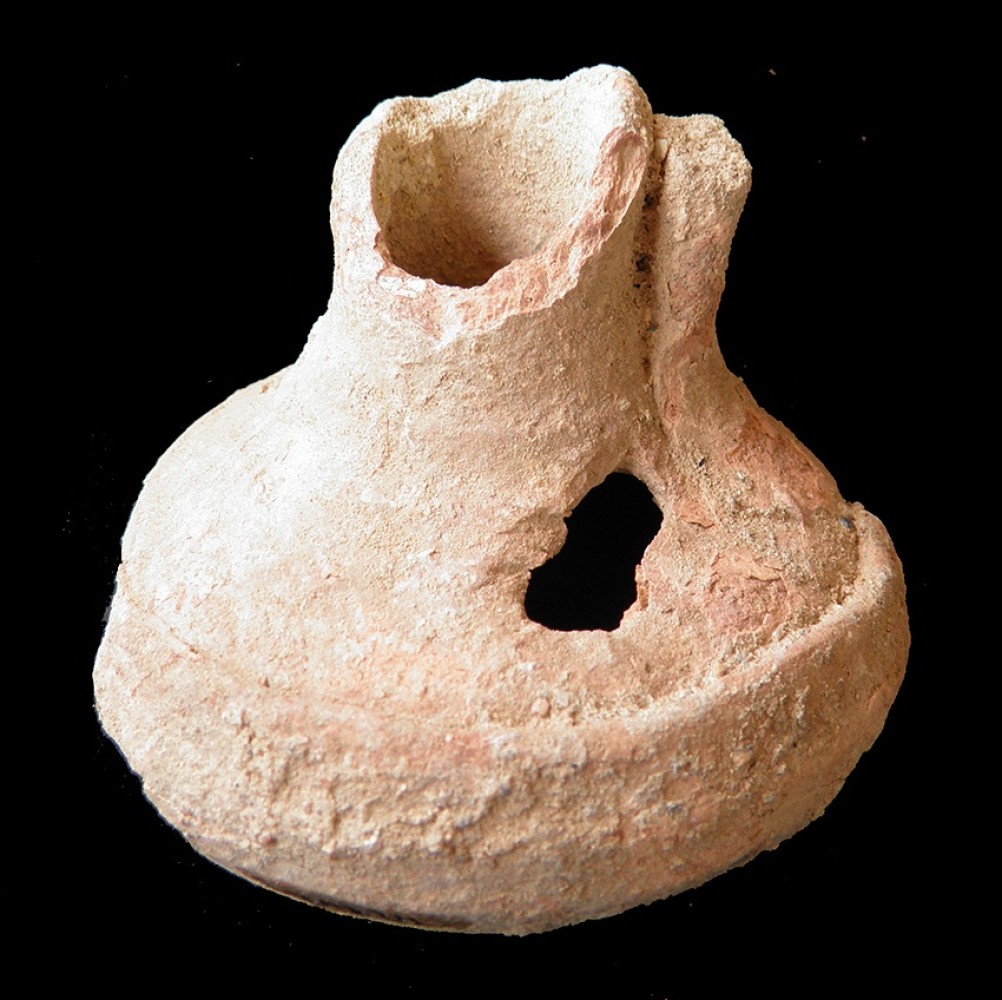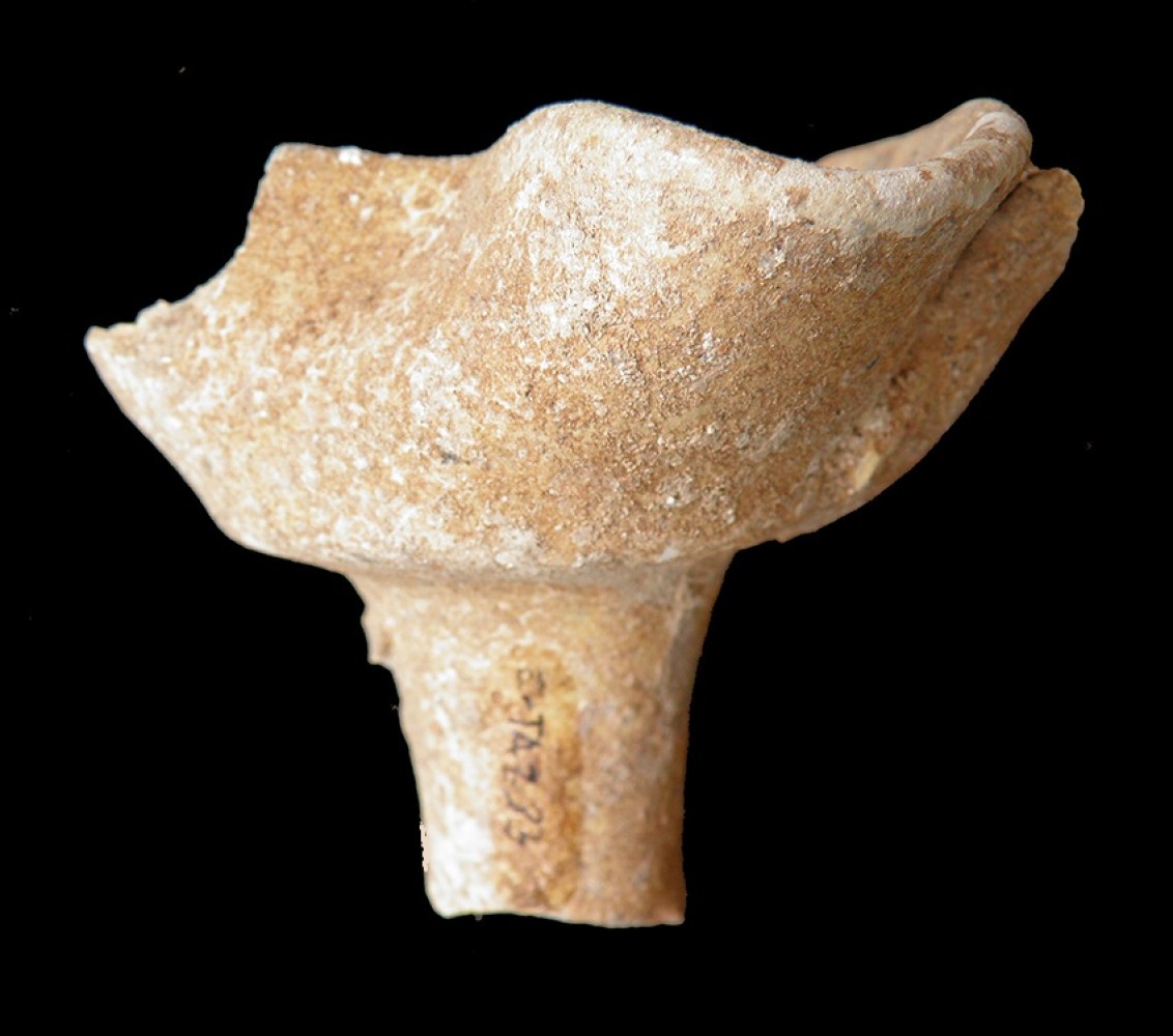 Fuste con cavidad basal. Cazoleta con piquera de pellizco y asa de sección oval.