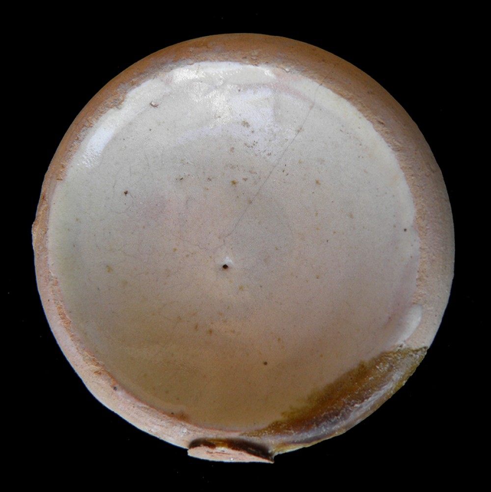 Vidriado blanco al interior, cubriendo la mitad del borde.