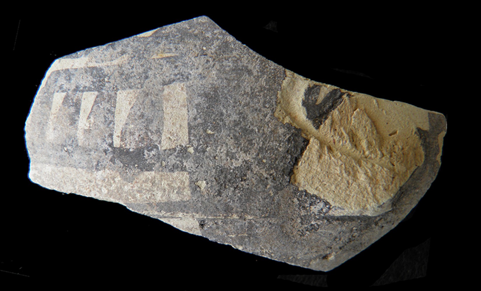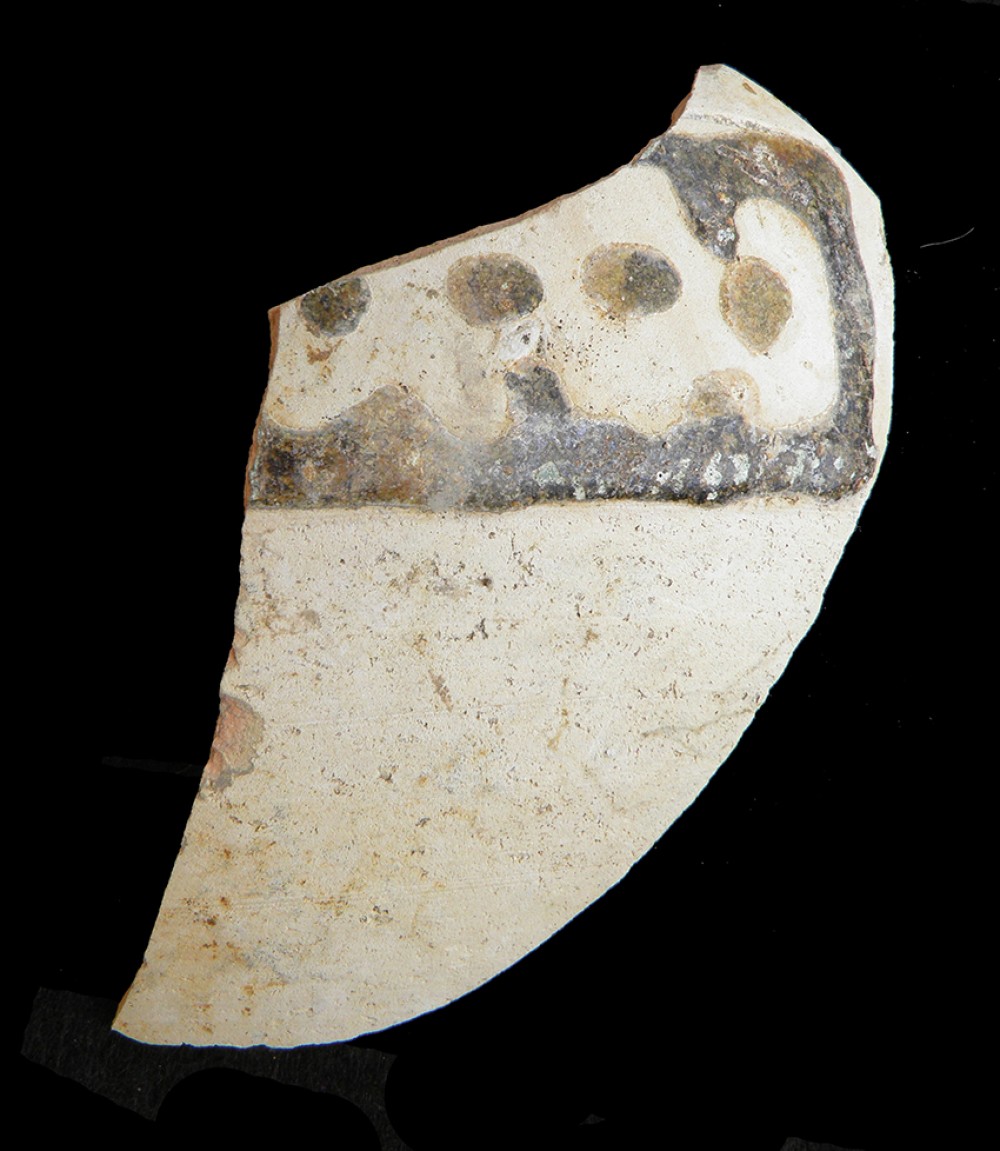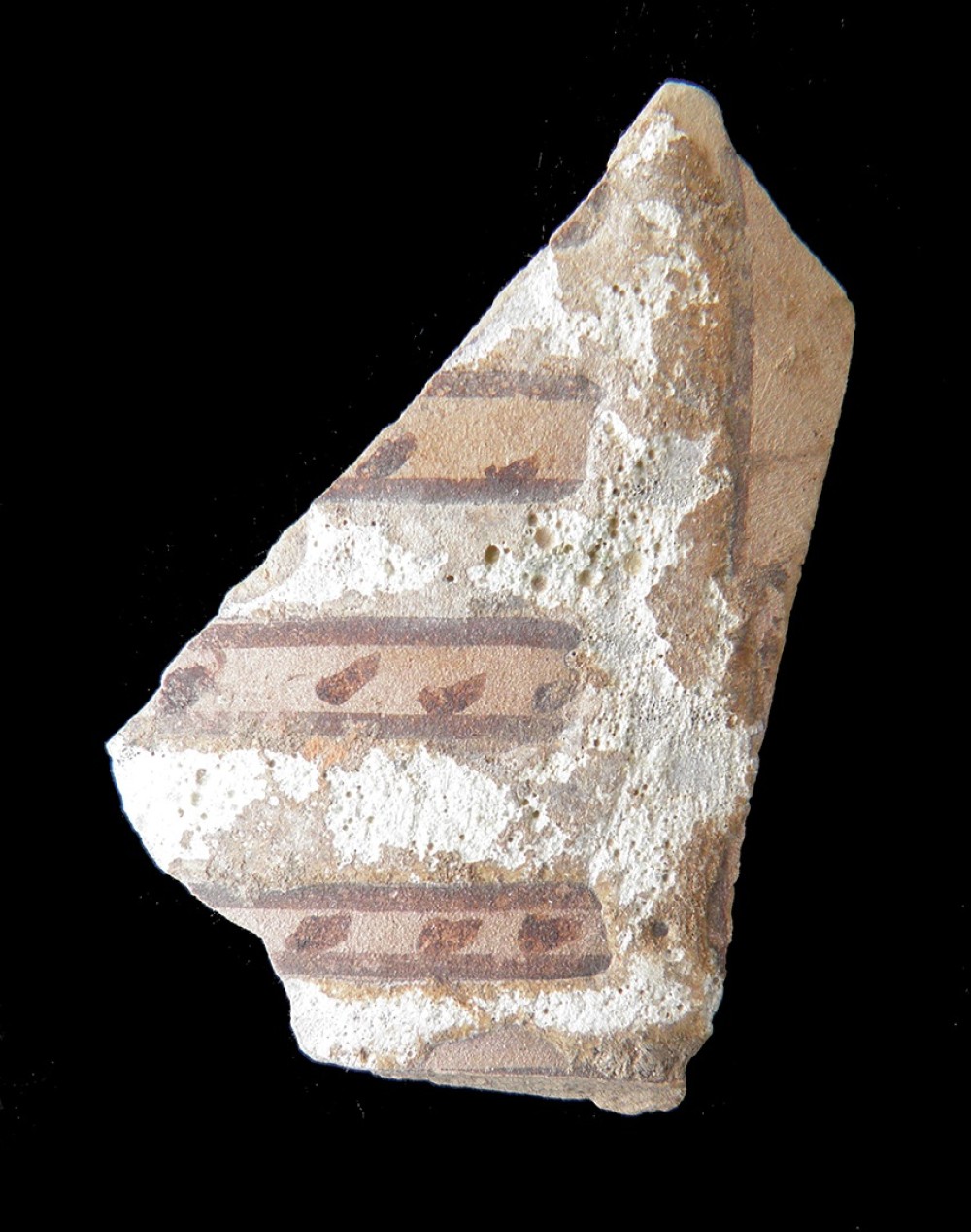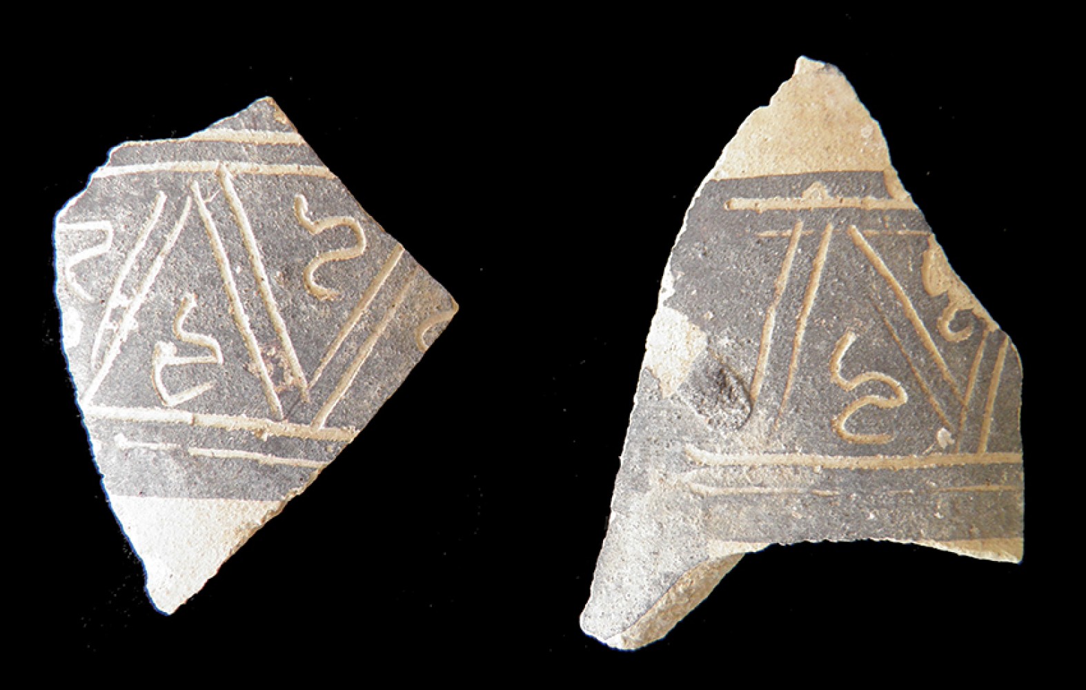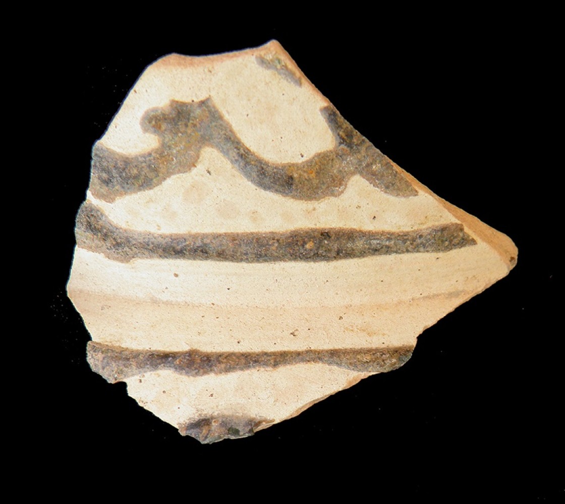 Manganeso y esgrafiado, bandas horizontales ocupada por ángulos con líneas serpenteantes en su interior