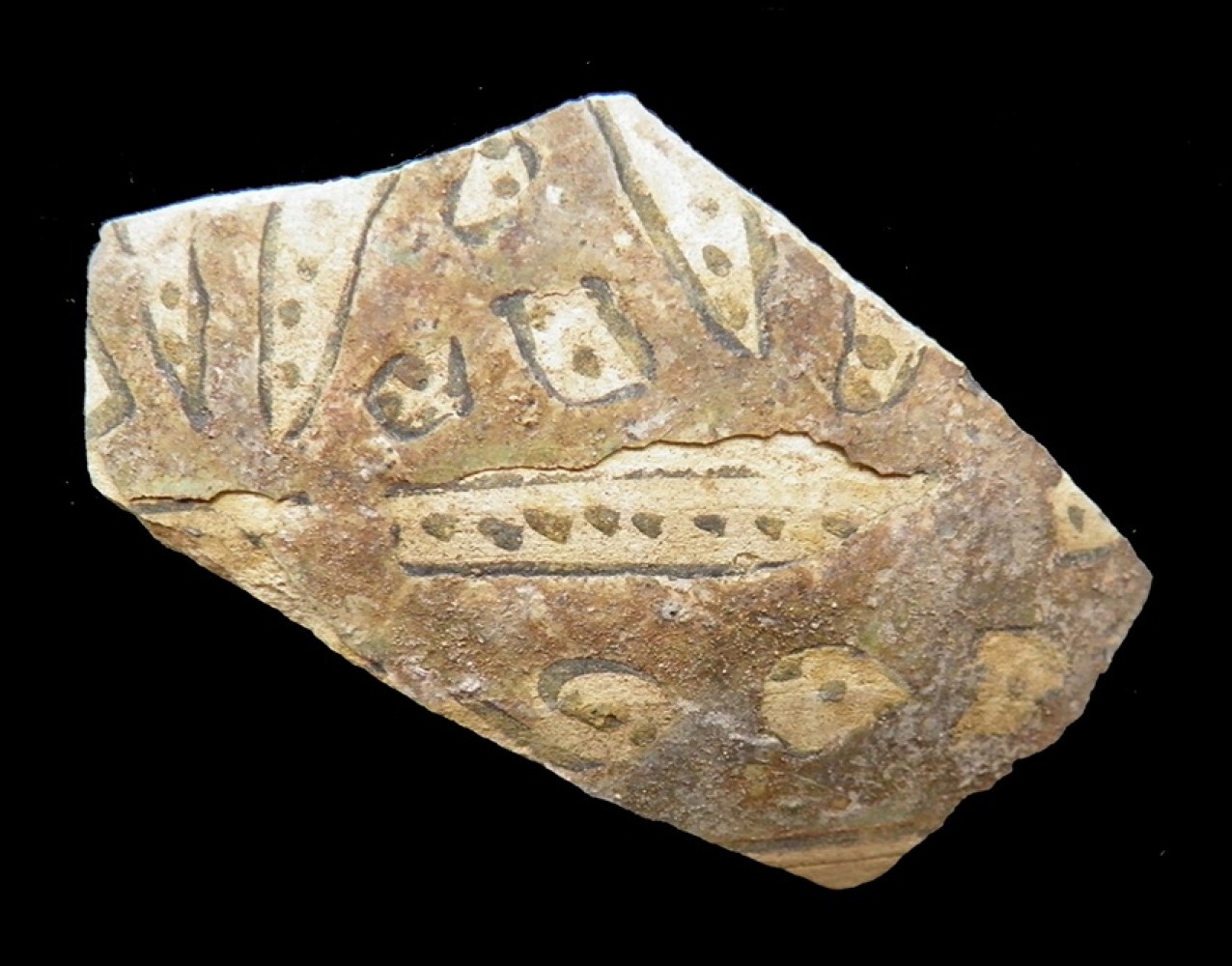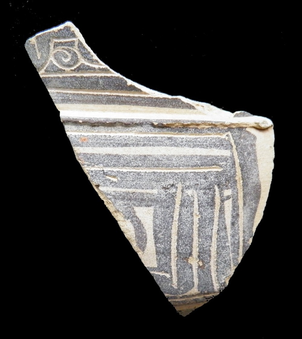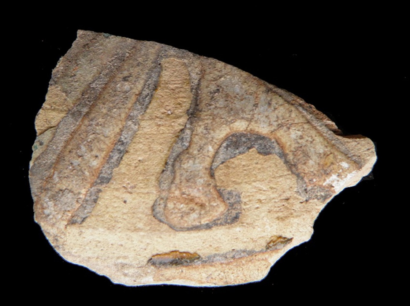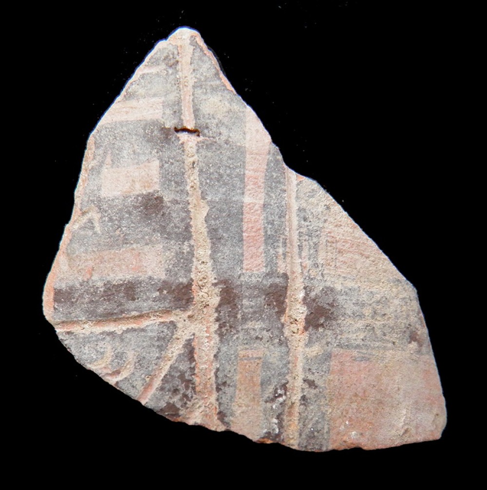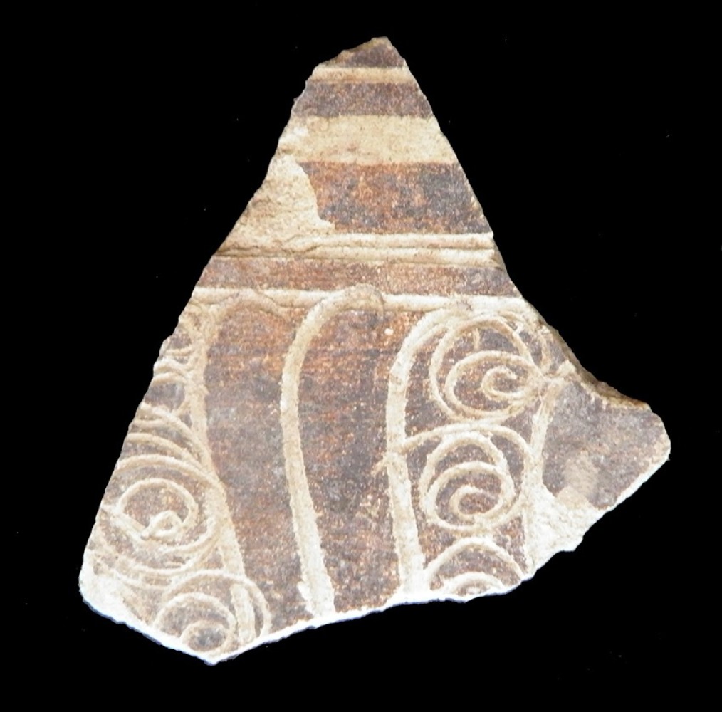Manganeso y esgrafiado, bandas horizontales de distinto grosor enmarcando la central ocupada por ángulos con líneas serpenteantes en su interior