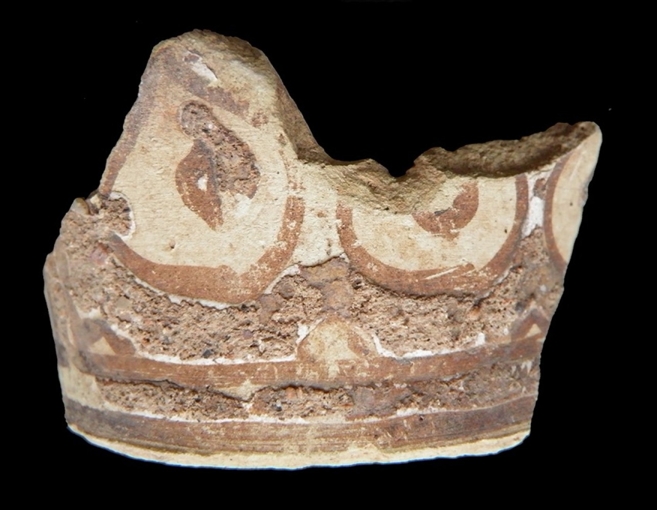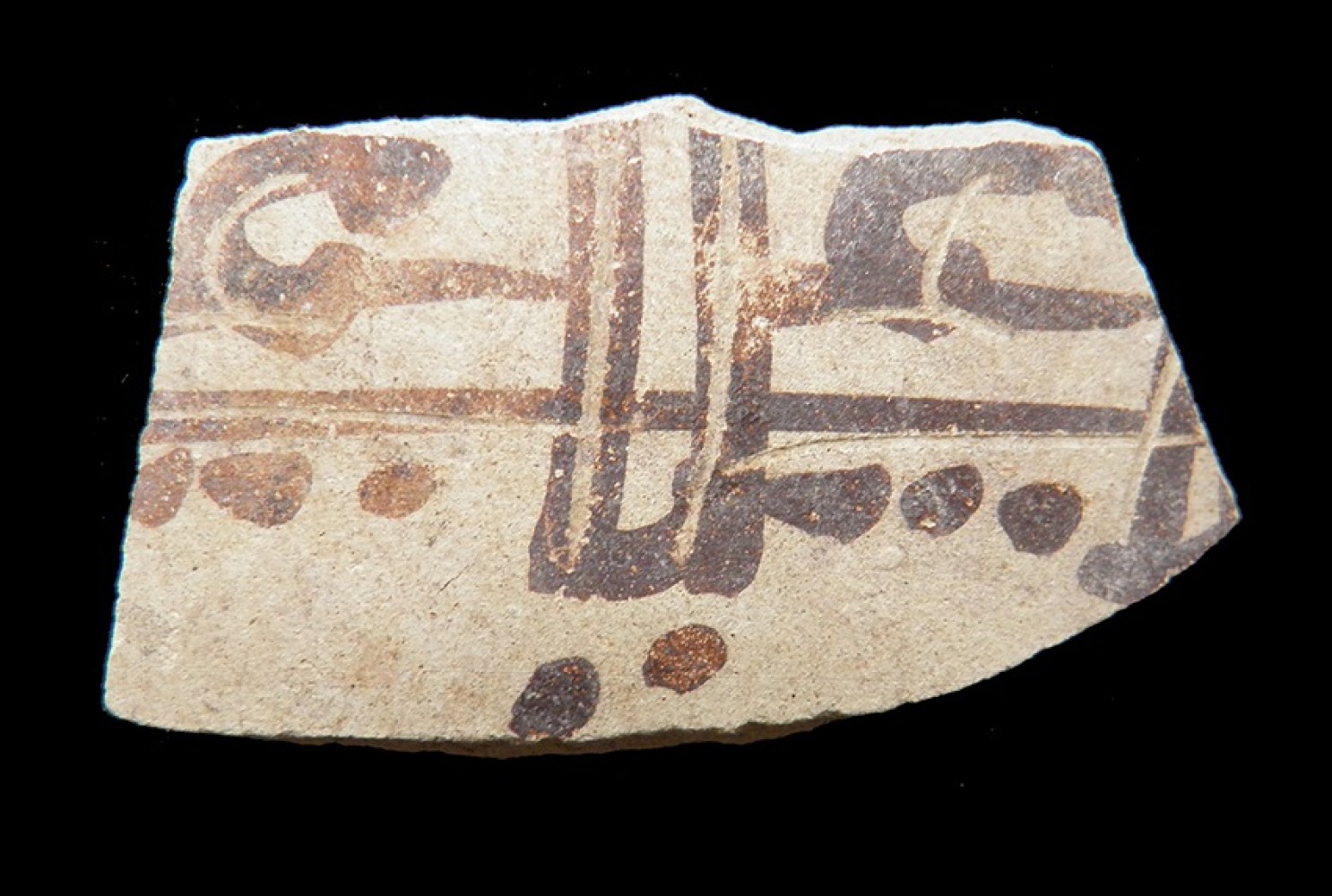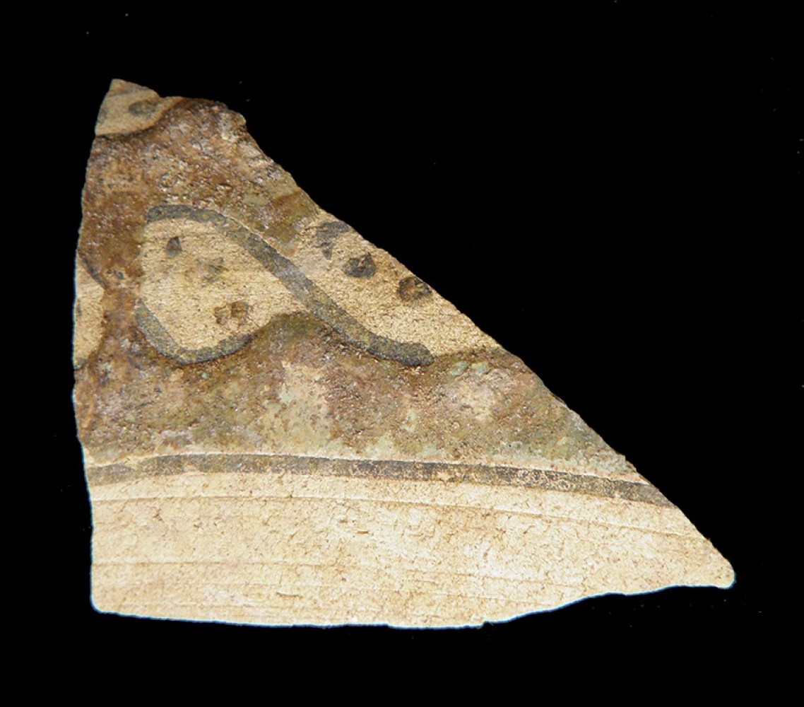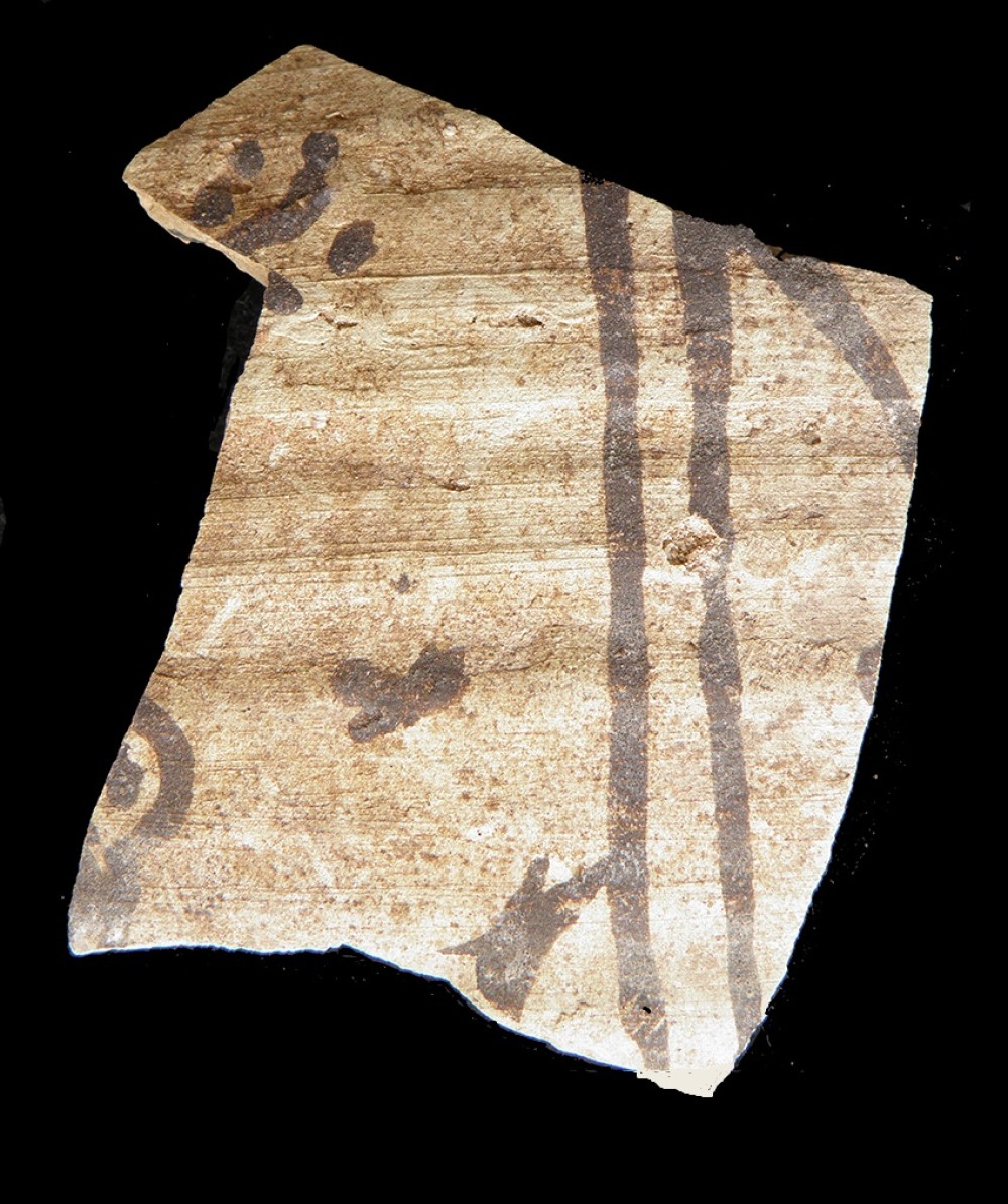 Manganeso y esgrafiado, bandas horizontales de distinto grosor enmarcando la central ocupada por ángulos con líneas serpenteantes en su interior
