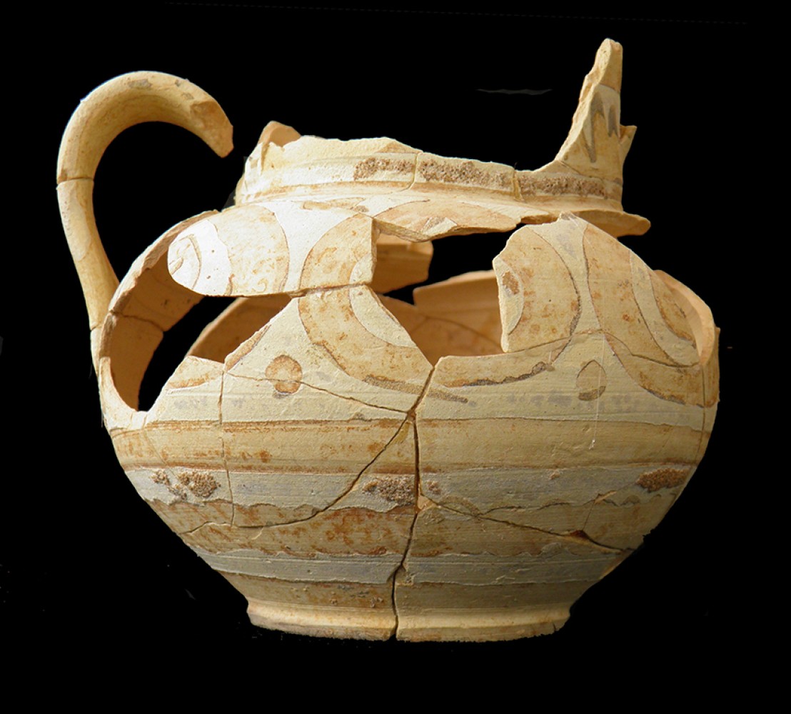 Jarra con dos asas dobles. El cuello troncocónico con filtro, el cuerpo de forma globular, se sustenta sobre un pie anillado.