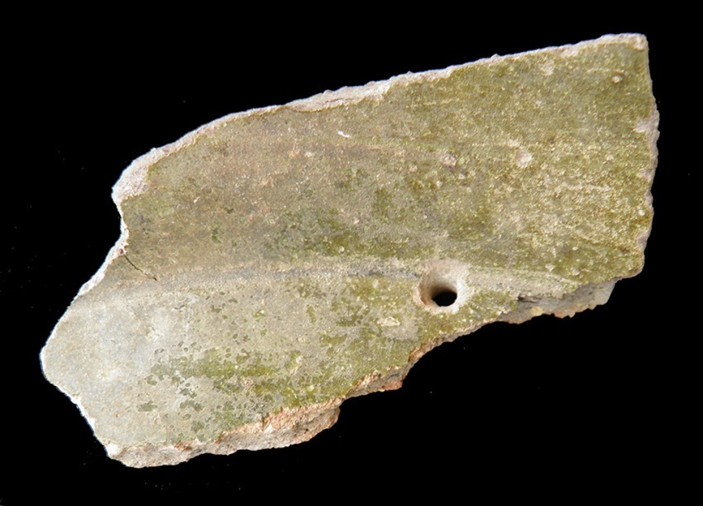 Fondo plano, cuerpo posiblemente troncocónico invertido. Un taladro posterior a la cocción.