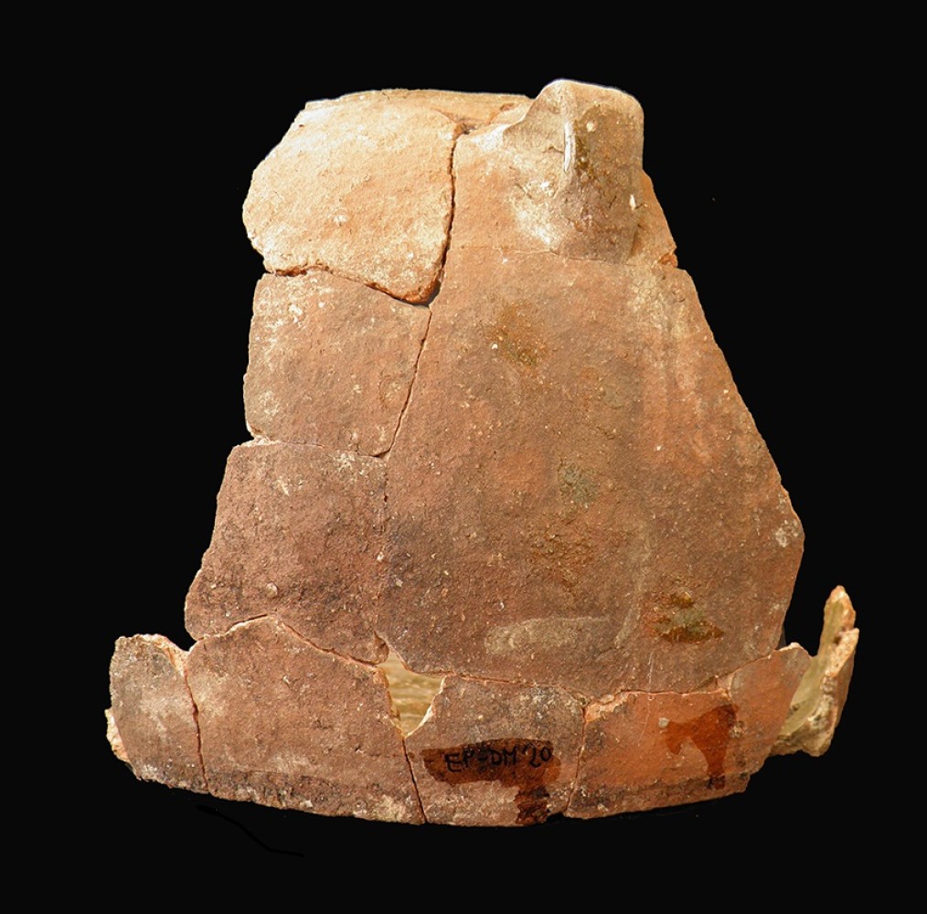 Pared abolsada que se estrecha hacia la parte superior. Borde oblicuo inclinado al interior. Queda un asa.