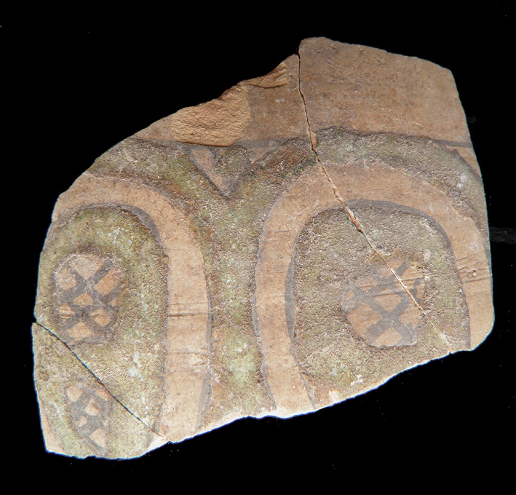 Cuerda seca parcial. Círculos en reserva sobre un fondo de vidriado verde, los círculo se rellenan con una retícula pintada al manganeso.