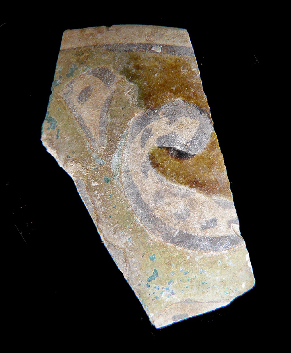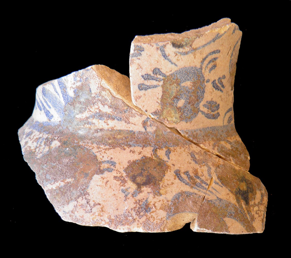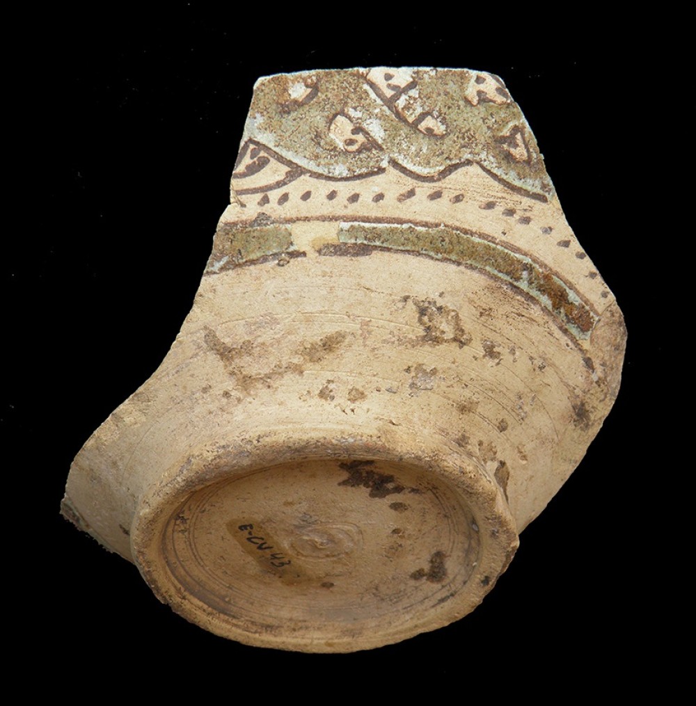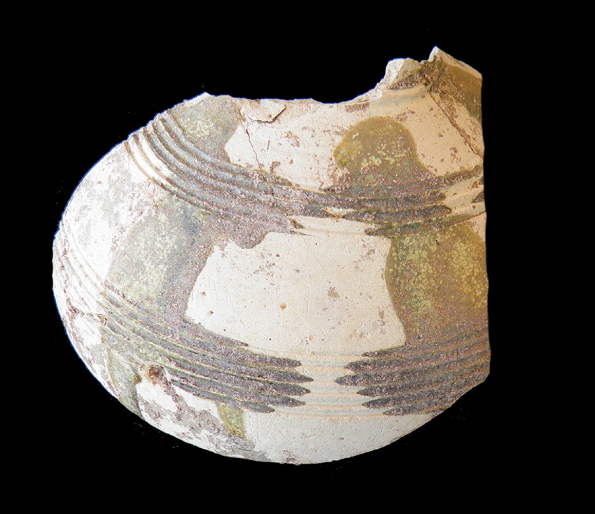Fragmento del cuerpo globular con decoración de cuerda seca parcial y sección de cuello.