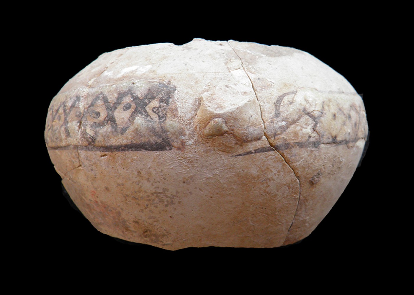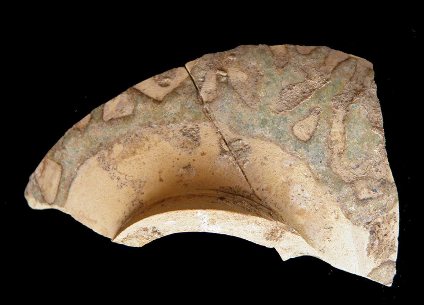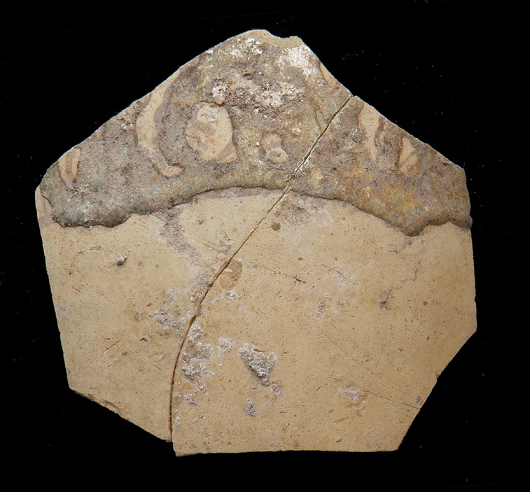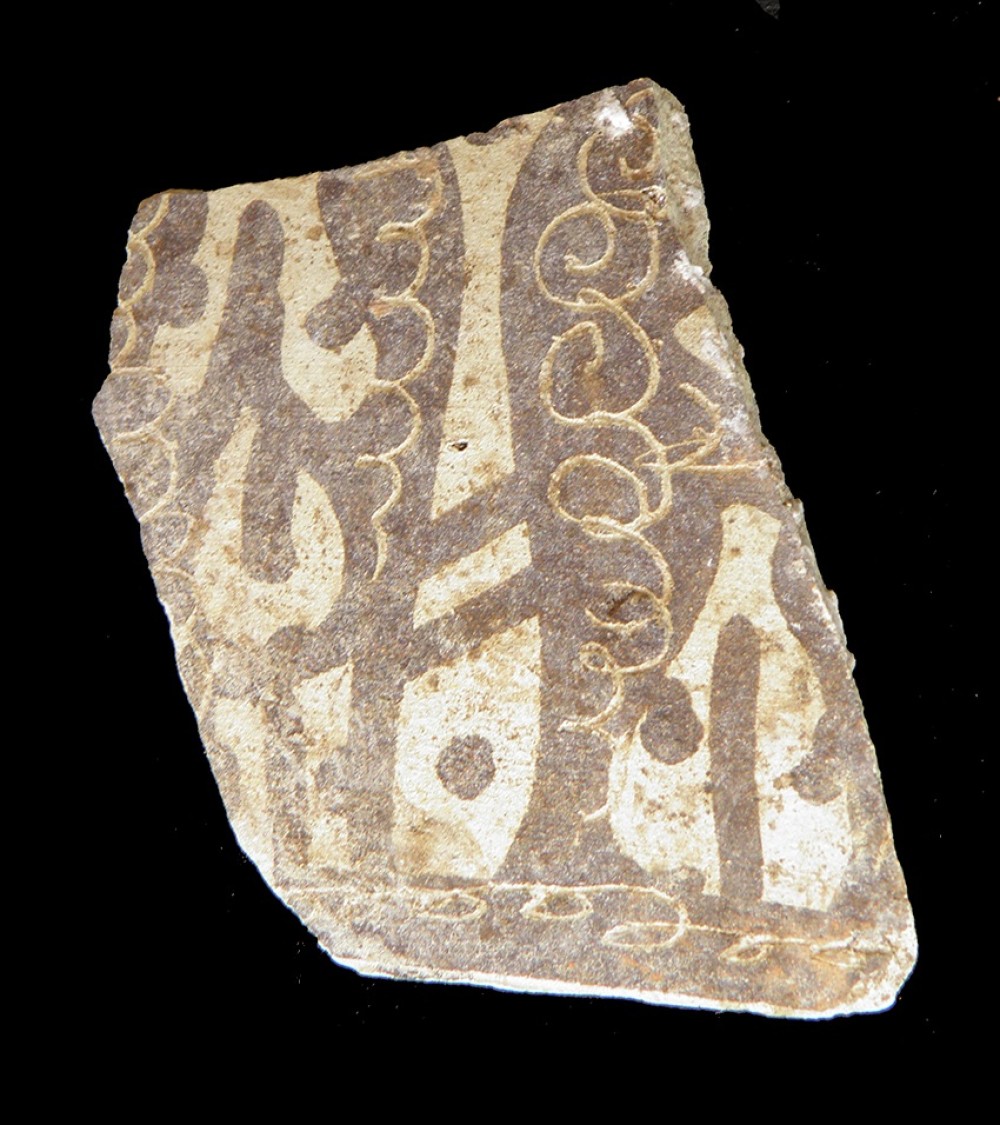 Fragmento del cuerpo globular con decoración de cuerda seca parcial y sección de cuello.