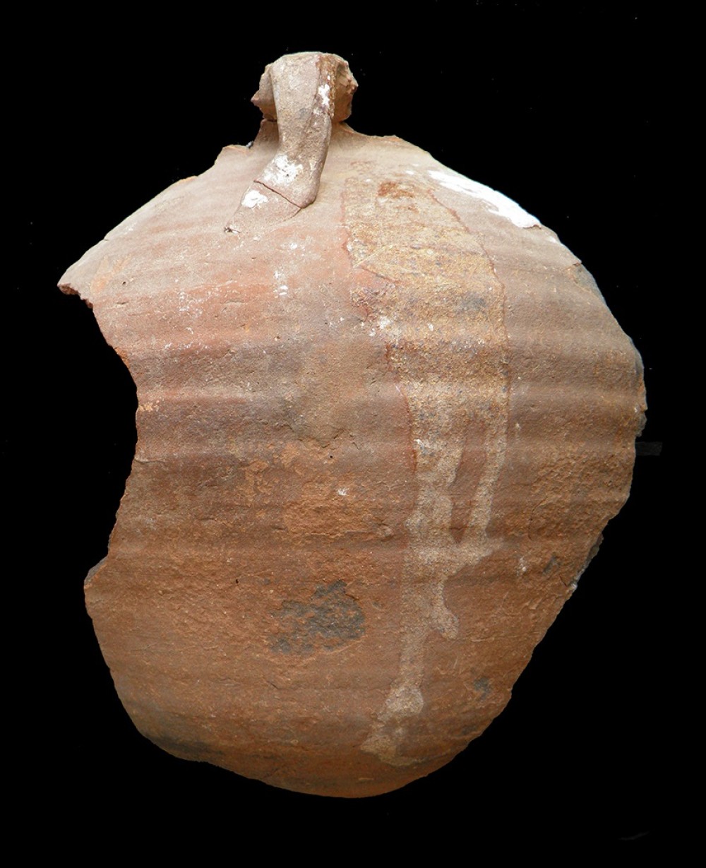 Cuello troncocónico con borde moldurado al exterior y cuerpo globular, arranque de asa.