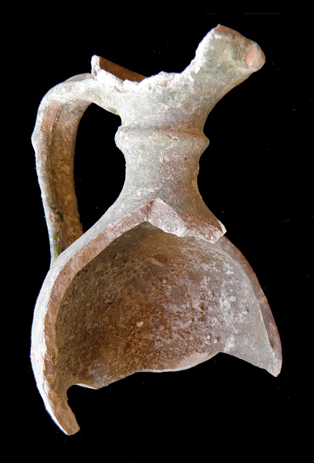 Cuello troncocónico con borde moldurado al exterior y cuerpo globular, arranque de asa.