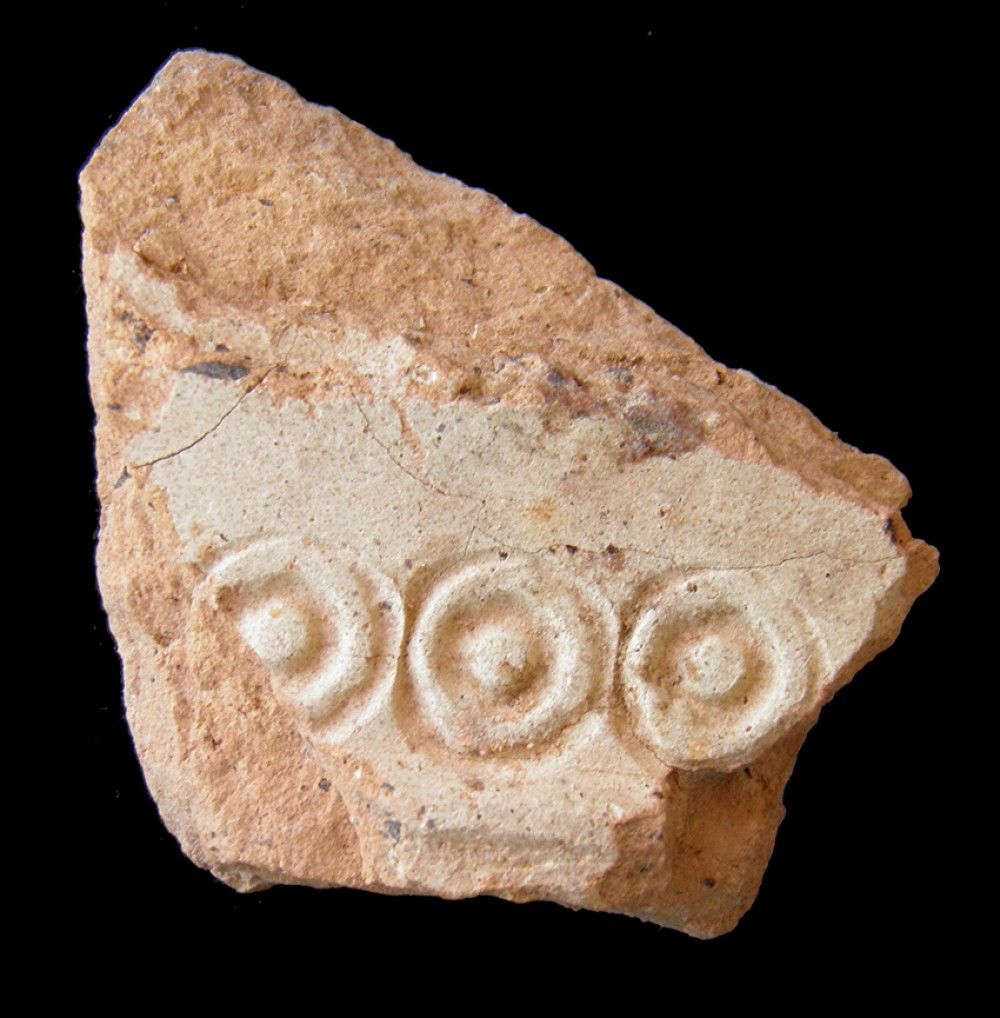En el cordón de refuerzo incisiones oblicuas paralelas a ruedecilla, entre cordones estampillado de circulos con un botón central.