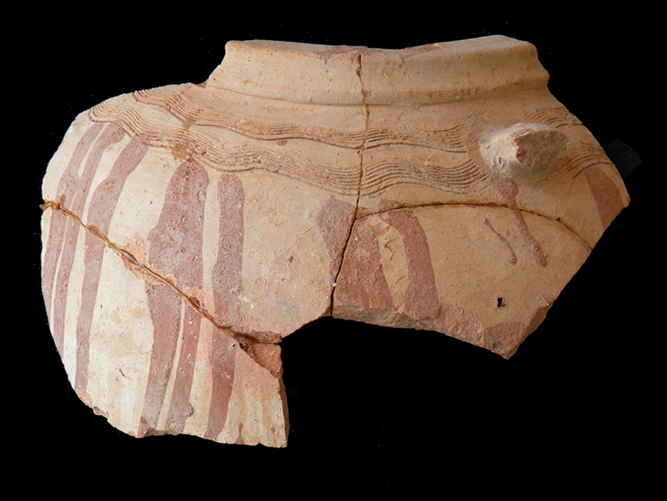 Fragmento de tinaja con tres cordones de refuerzo de los que solo queda un trozo de uno,