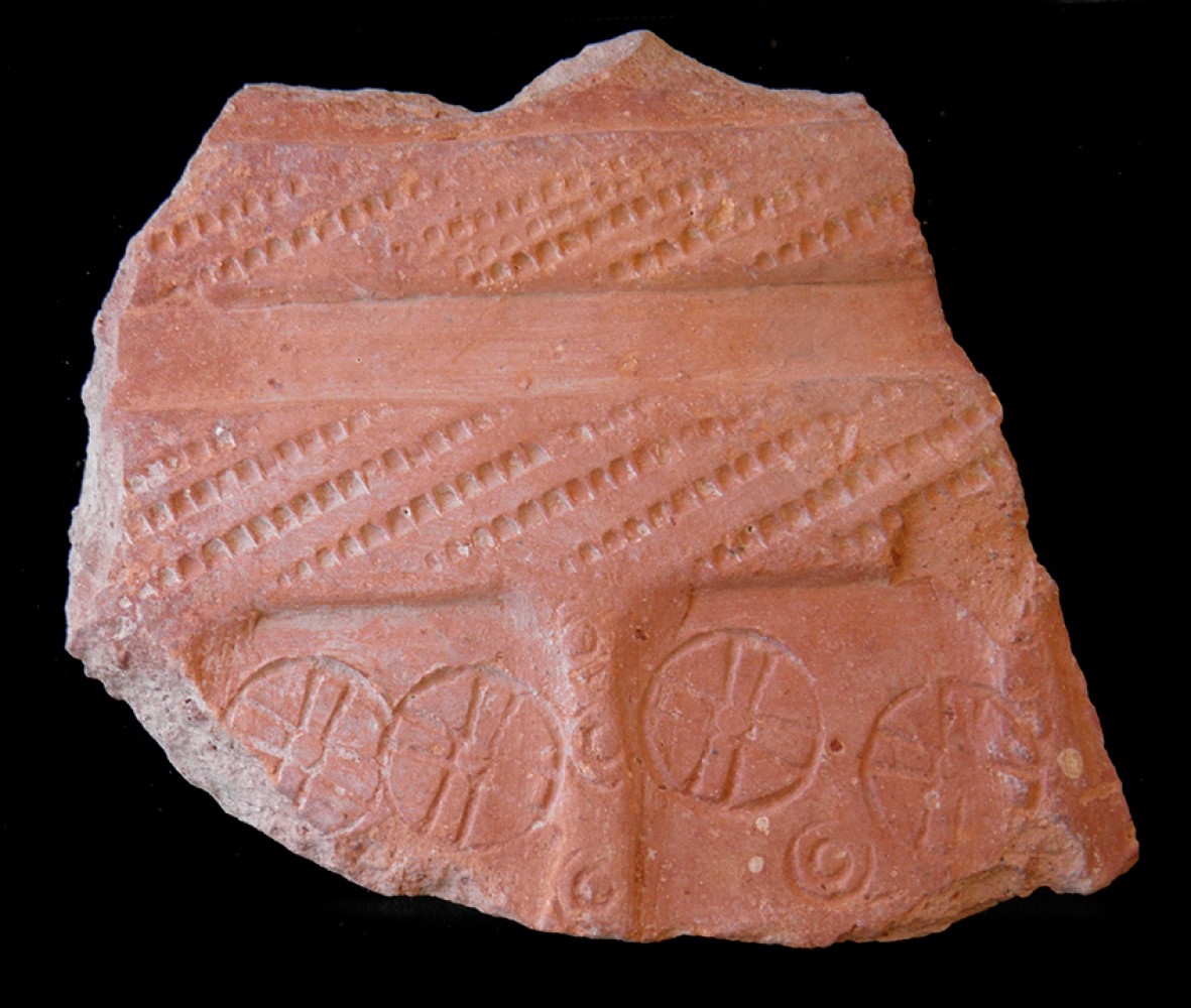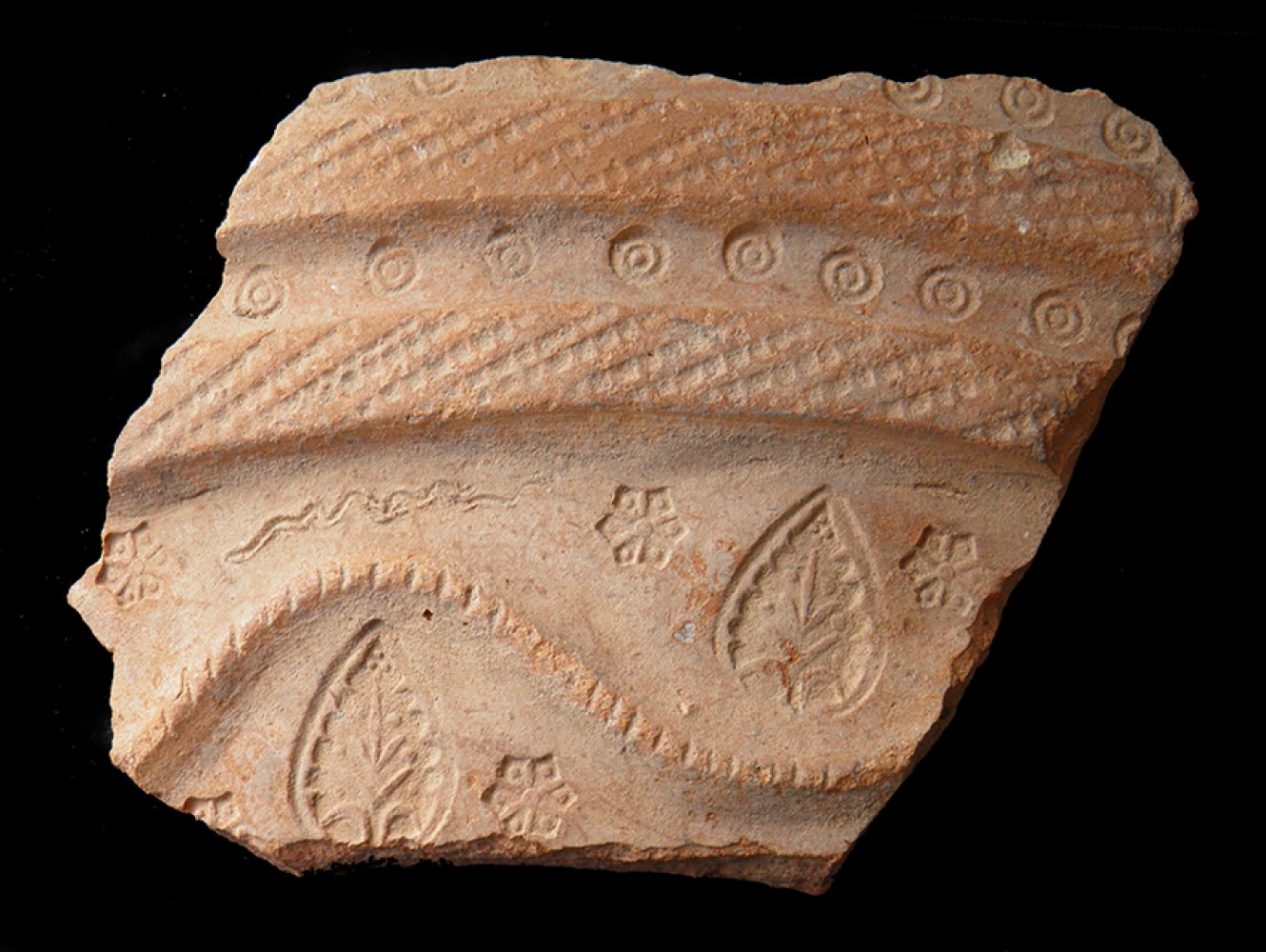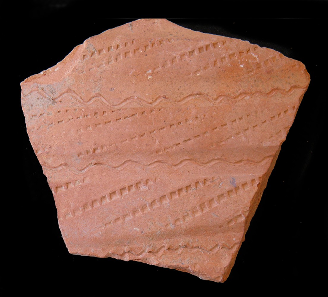 Moldura ondulada con incisiones paralelas y cordón de refuerzo con estampillado fitomorfo.