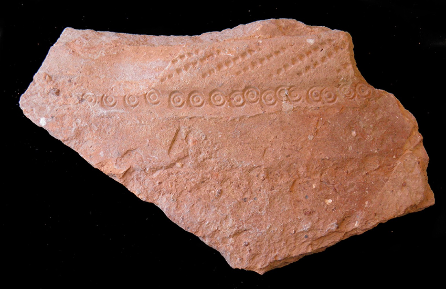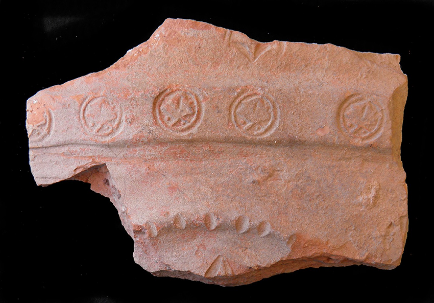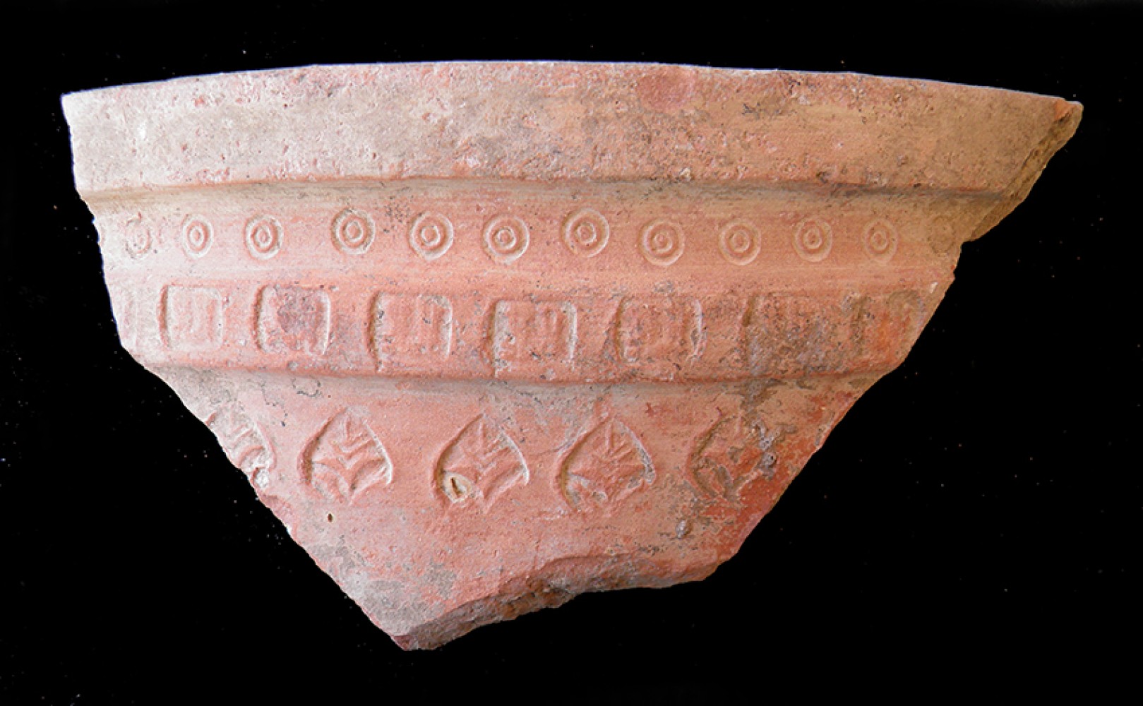 Moldura ondulada con incisiones paralelas y cordón de refuerzo con estampillado fitomorfo.