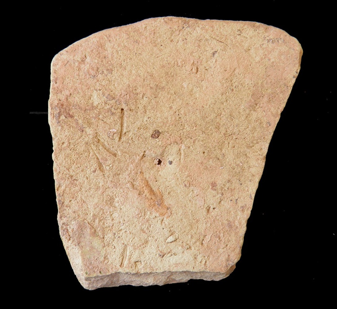 Vedrío melado-amarillento al exterior. En manganeso, tres grupos de dos trazos verticales ocupando cuello y cuerpo.