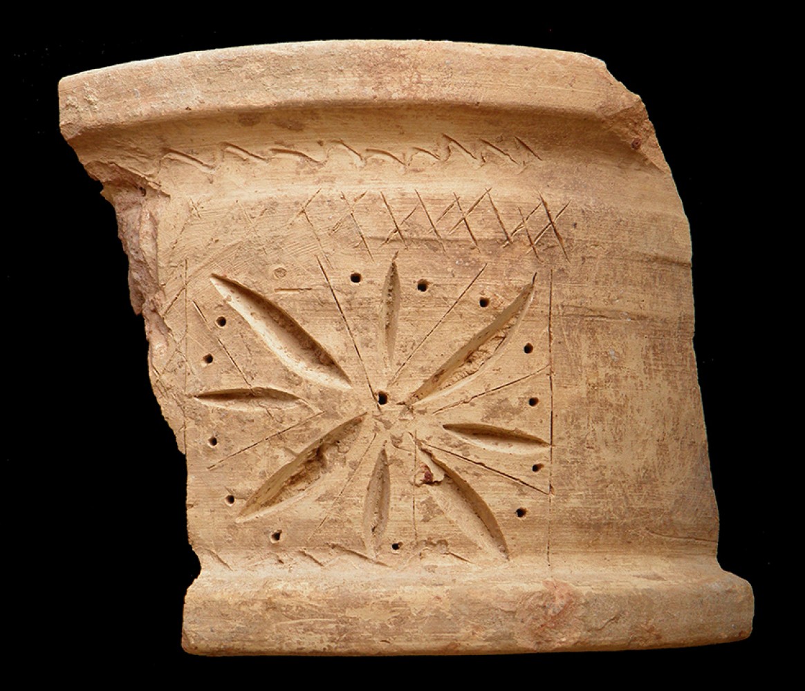 Ondas incisas bajo el reborde superior ,cruces y puntos. Incisión y extracción de materia en el cuerpo formando un dentado, estrella y roseta.