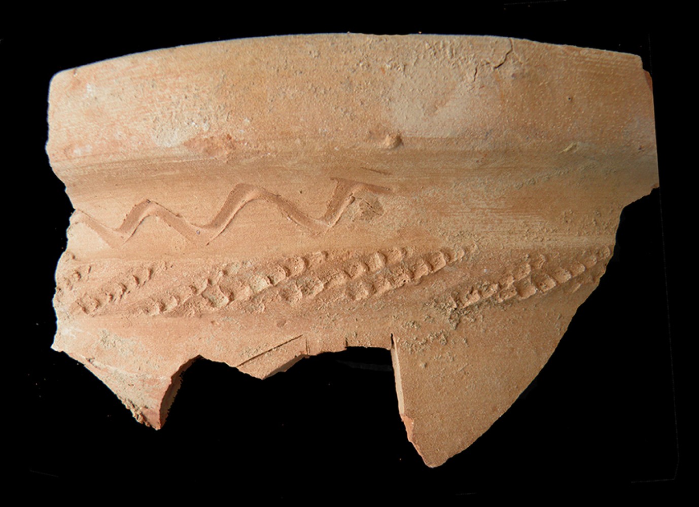 Ondas incisas bajo el reborde superior, cordón de refuerzo con impresiones oblicuas de ruedecilla dentada. Incisión y extracción de materia, y calado en el cuerpo.
