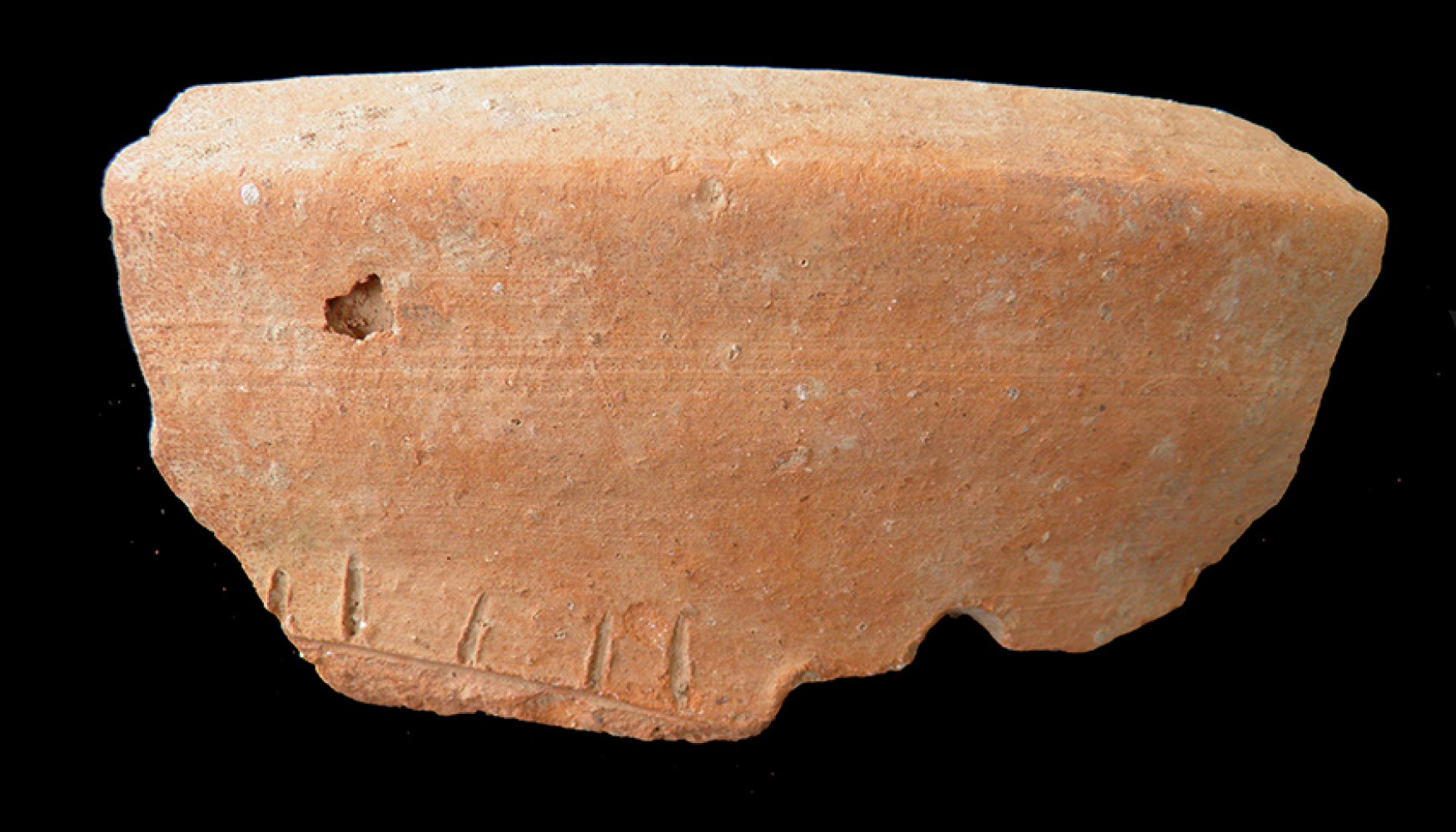 Líneas incisa horizontal laga y verticales cortas sobre ella y punto lado.