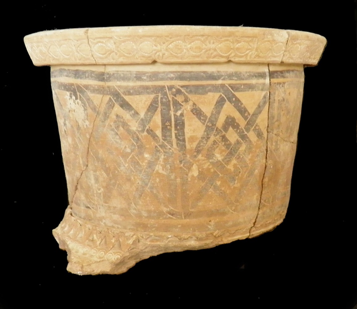 Decoración incisa a "peine", doble linia de meandros desiguales bajo el borde exterior.