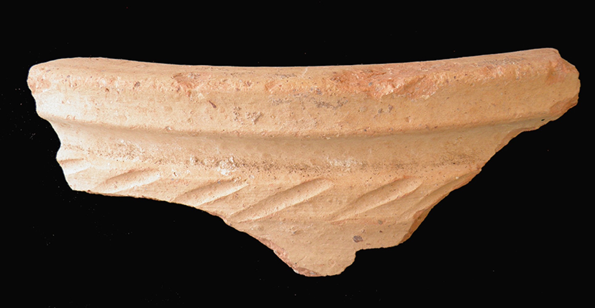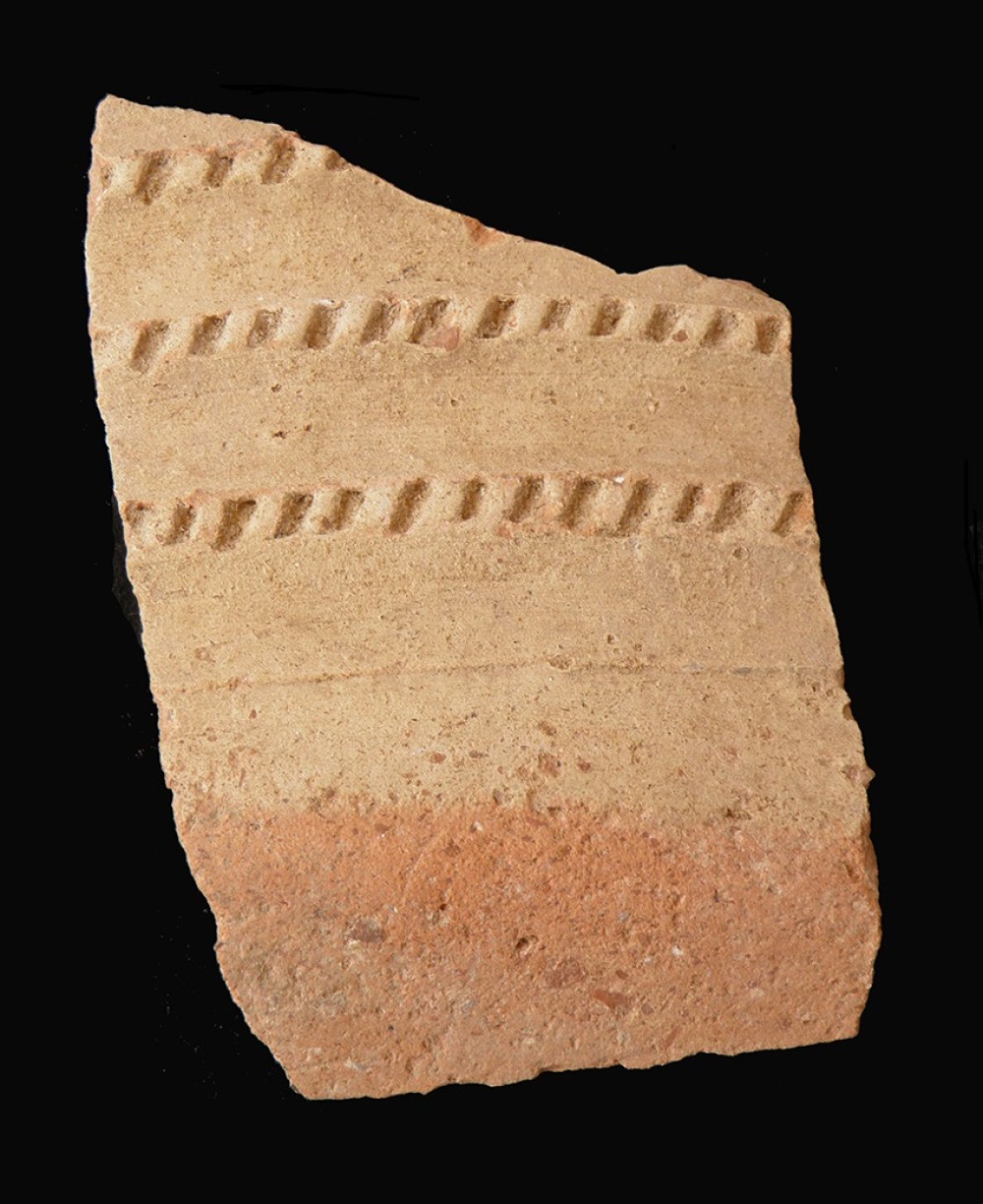 Incisa a mano formando meandros desiguales bajo el borde exterior y en su parte central y con incisiones en diente de sierra, en la moldura central. Dos chorreones verticales de vidriado verde,
